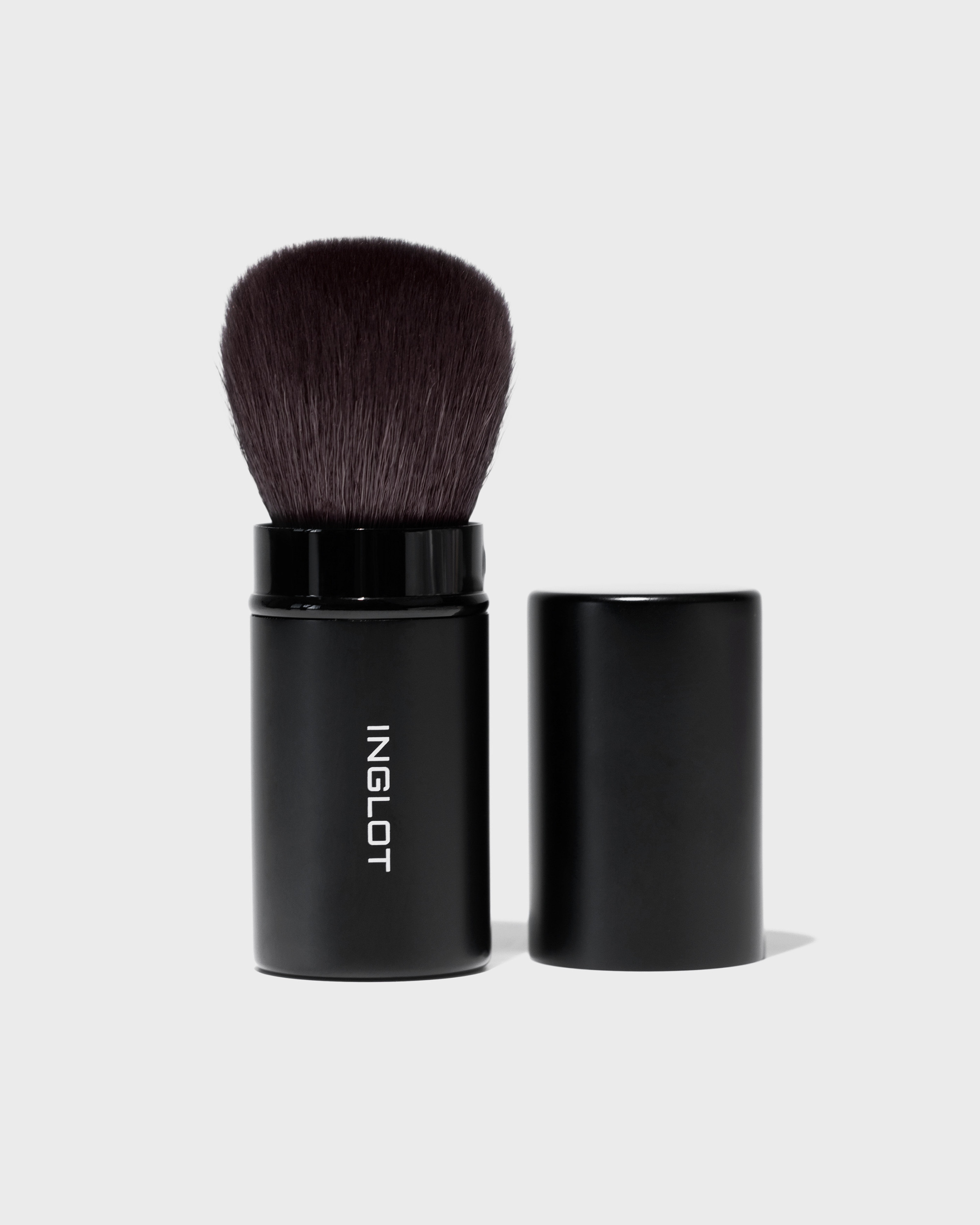 Ein einziehbarer Pinsel, der für das Auftragen von gepressten Kosmetika wie Puder, Rouge, Bronzer und Highlighter entwickelt wurde. Er verfügt über kurze und dichte Borsten, die es ermöglichen, die Deckkraft zu variieren. Der Pinsel ist in einem schwarzen Metallgehäuse eingeschlossen, das eine bequeme und hygienische Aufbewahrung in einer Kosmetiktasche ermöglicht.