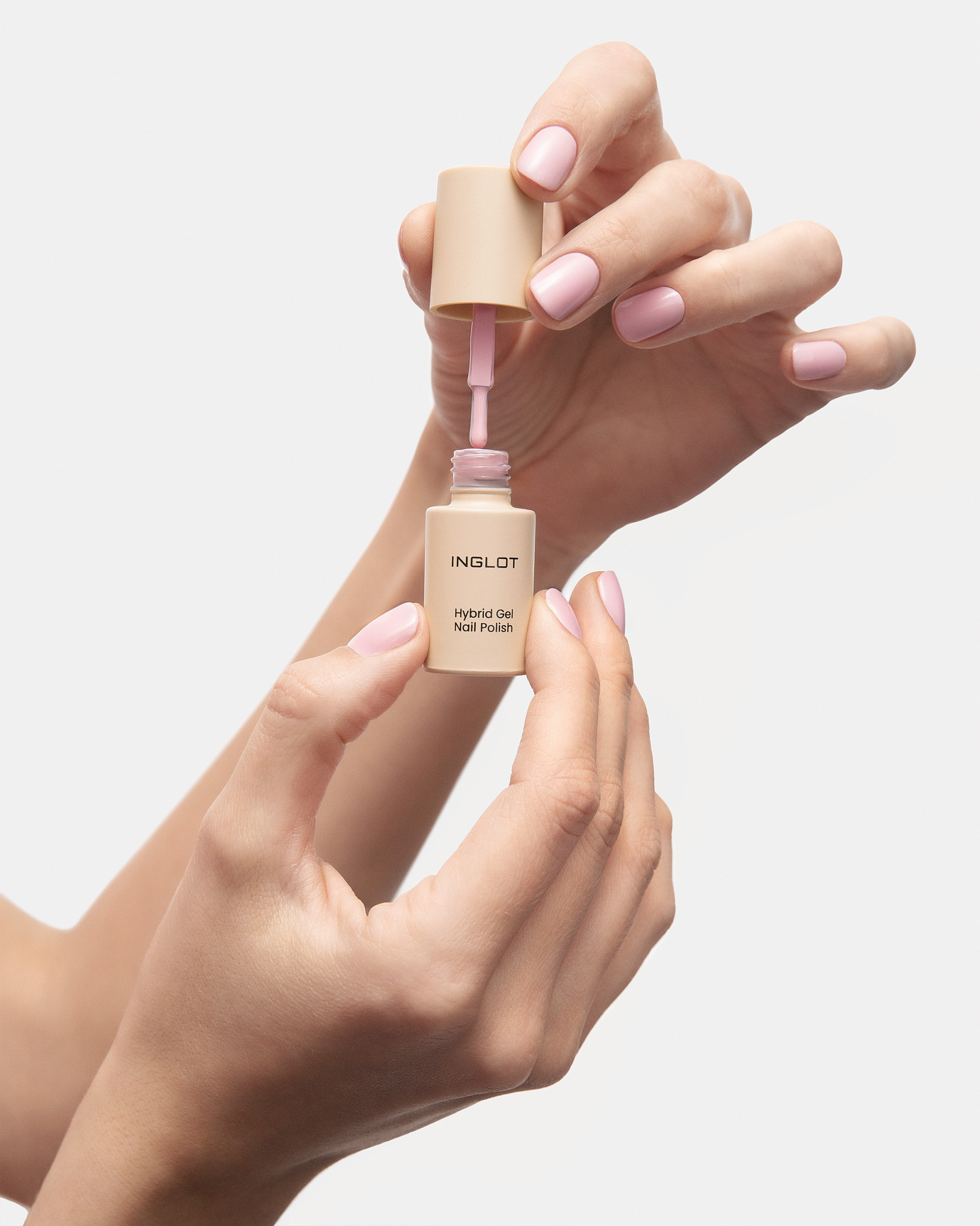 Apply a thin layer of the colored hybrid nail polish on a previously cured Hybrid Base 01 or Keratin Hybrid Base 02 and cure it under a UV/LED lamp. To achieve a satisfying effect, you may repeat this step. Protect the styling by applying and curing the Hybrid Top Coat for nails. Cure under a UV lamp for 120 s or LED 60-90 s.